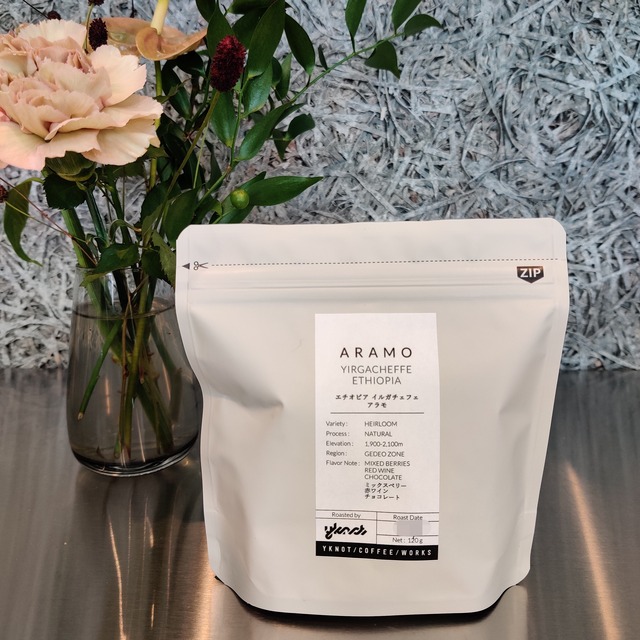 120g / 焙煎:浅め ARAMO YIRGACHEFFE / ETHIOPIA NATURAL 古くは最高級ウォッシュト精製豆の産地として知られていたイルガチェフェですが、近年は完熟コーヒーをアフリカンベッドで丁寧に天日乾燥したナチュラル精製の豆もスペシャルティ・コーヒーの世界で定評を得るにいたりました。さらにここ数年は、イルガチェフェの中でも特に高品質で特徴的なコーヒーを産する特定地区の名前が知られるようになってきました。アラモ村もそのような地区の一つで、柔らかさの中にしっかりと甘みを秘めた、熟したトロピカルフルーツのフレーバーが特徴です。 当店の豆は焙煎日から1〜3週間が一番の飲み頃です。 従って焙煎日より7日以内の豆を発送いたします。 賞味期限は焙煎日より2ヶ月と表示しておりますが、"消費"期限ではございません。 当店の豆パッケージはPET(ポリエチレンテレフタレート)素材にアルミニウムを高真空状態で加熱蒸着させた特殊な袋を使用しています。コーヒー保存の大敵である酸素、光、湿気を完全に遮断し、豆を新鮮な状態に保ちます。さらに開封後も簡単に密閉できるファスナー機能と、外気の侵入を防ぎつつコーヒーから出るガスだけを外へ放出するバルブ機能も装備しておりますので、キャニスター等に移し替えず、このパッケージのまま常温で保存ください。